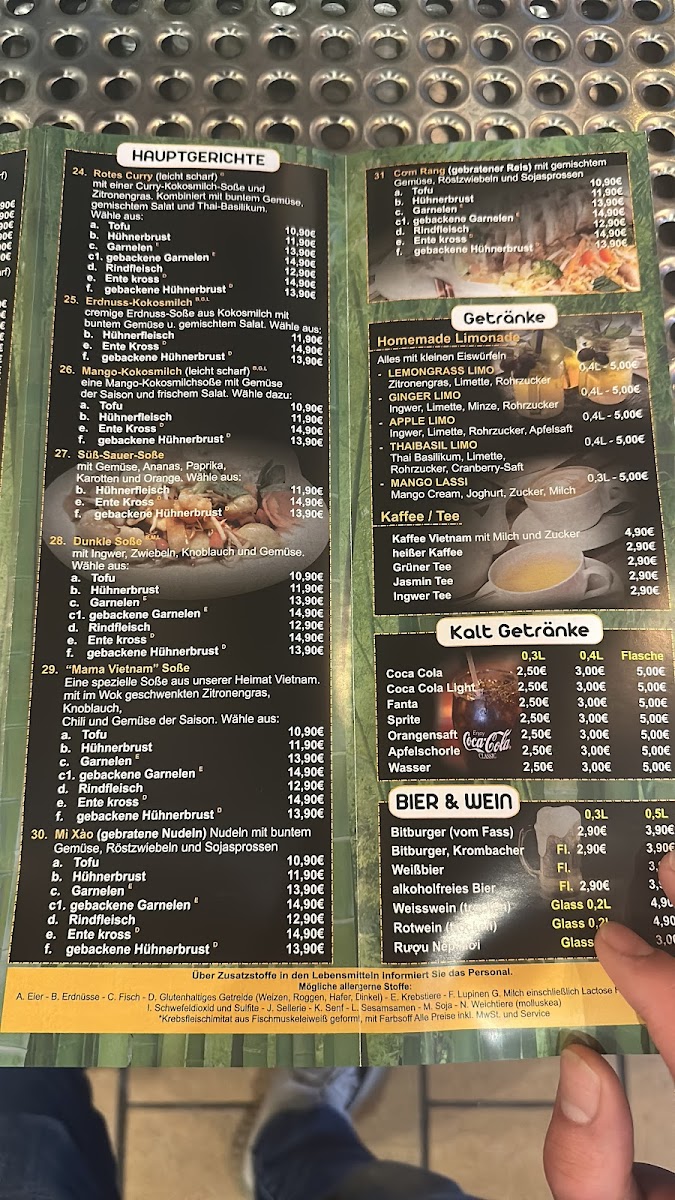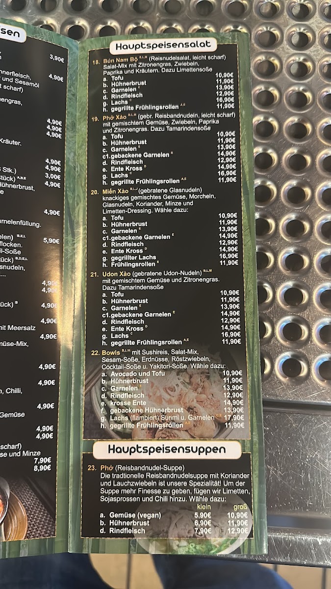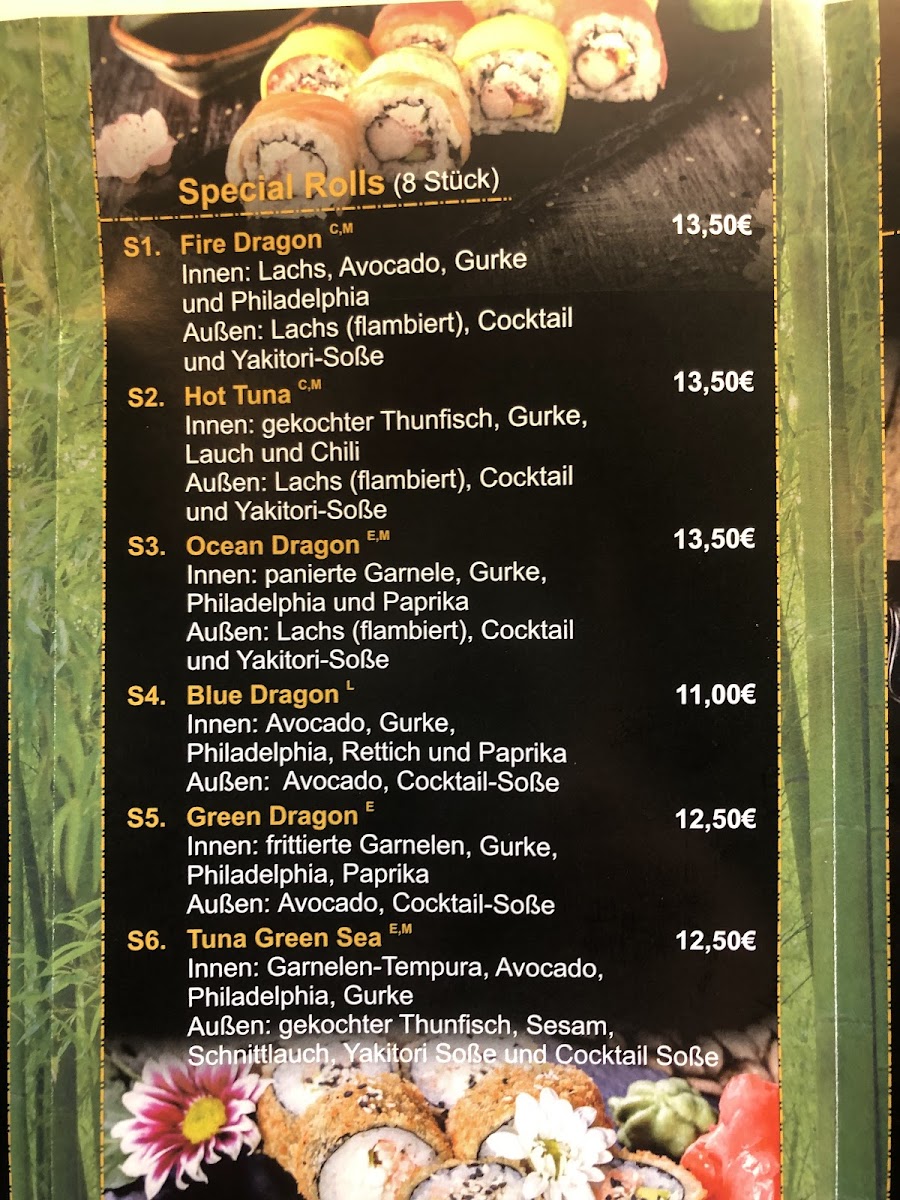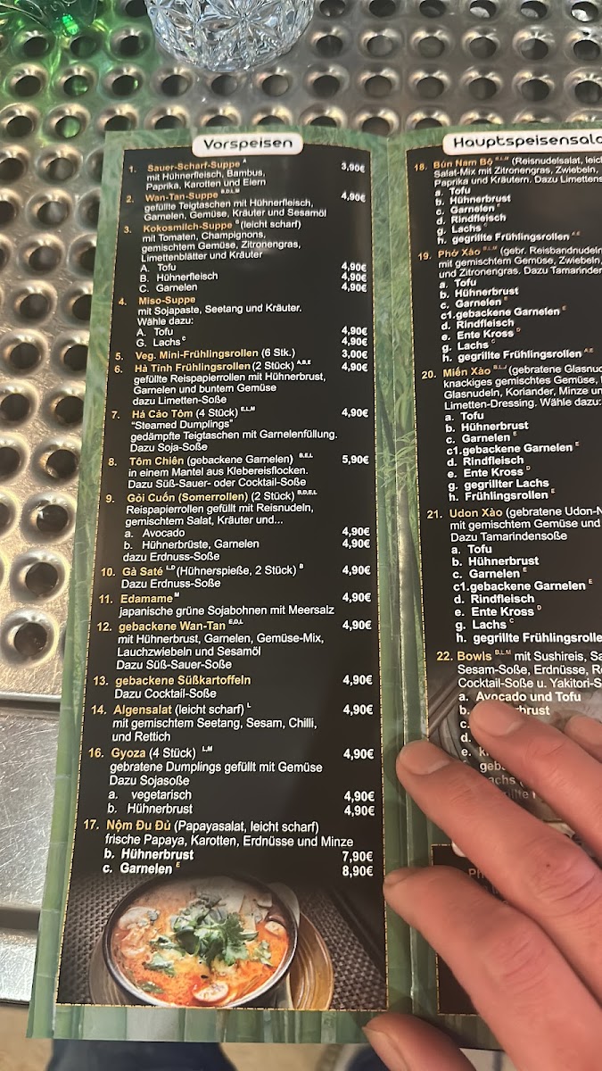Highlights like the Ente Süß Sauer (sweet and sour duck), warming Hot and Sour Soup, or the rich Rotes Curry Mit Garnelen (red curry with shrimp) provide satisfying options for lunch or dinner. For those looking for something lighter or more casual, choices such as freshly made Sashimi, Edamame, and a variety of sushi rolls offer a refreshing balance, ideal for relaxed gatherings or a quiet evening.